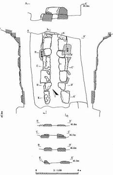 全長70mの前方後円墳、後円部径47m・高さ7m 前方部幅42m・高さ7m 蕪木古墳群の中で最大規模の前方後円墳 二重の周溝 幅7m以上の内堀が墳丘西~北面に残り、幅約5mの周堤の一部も残る。 墳丘中段の前方部側で円筒埴輪や形象埴輪が出土し、後円部側で円筒埴輪のみが出土 芝山町立はにわ博物館で展示されている。 北側くびれ部にある複式構造の横穴式石室は長さ4.1m ・幅4.3m・高さ1.5mの幅広で中央に棺床がある。 凝灰質泥岩(シルト岩と砂の混合岩)で構築されている。埋め戻し 石室から管玉や土師器片、須恵器片が出土 6世紀後半の築造と推定されている。 埋葬部は、昭和27年に石室の発掘調査 (山武市HPから) |