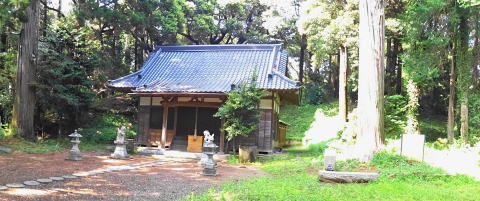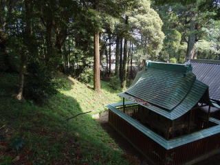 ![]() 社殿の背後に横向きに墳丘がある。、社殿がくびれ部を一部破壊している。 |