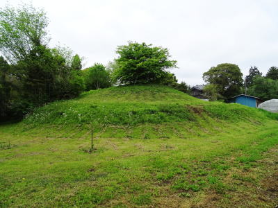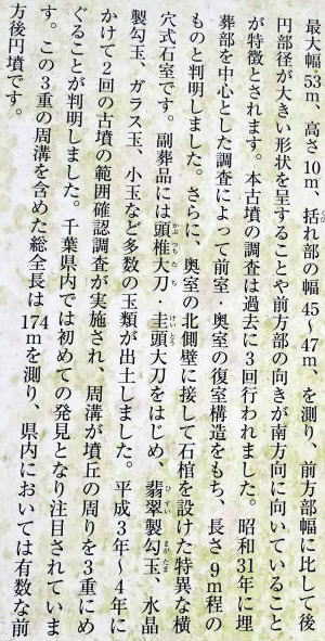 全長63mの前方後円墳 前方端幅30m 後円墳直径30m 墳丘高8.8m 周囲には幅5mの溝と外堤が巡る。 南側くびれ部に横穴式石室(石材凝灰質泥岩)があるが、 現在は埋められて見ることができない。 玄室長2.5m、幅1.4m、玄室高さ1.7m 床面石敷き(排水溝あり) 羨道長2.3m、幅1.24m、 石室側面に人物・馬の線刻画があった。 青色ガラス小玉、鉄鋲片、鉄鏃片、コハク製棗玉、耳環、人骨等が出土。 6世紀後半の築造と推定されている。 昭和18年、21年、22年に調査、詳細不明 昭和26年に本格的学術調査 (山武市教育委員会HPほか から) |
