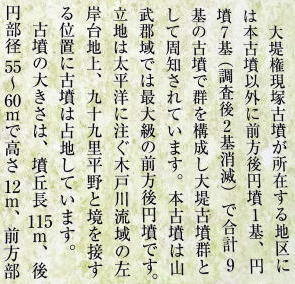 大堤権現塚古墳は 全長115mの前方後円墳、後円部径60m・高さ12m 三重の周溝があり、総全長は174mとなる。 後円部に、複室構造の横穴式石室がある。 奥室は2.1m×3.5m、前室は3.1m×1.5m、羨道は2m以上×1.5m 奥室に作り付けの石棺がある。 頭椎大刀、圭頭大刀、金銅製刀子鞘、玉類などが出土 7世紀初めの築造と推定されている |