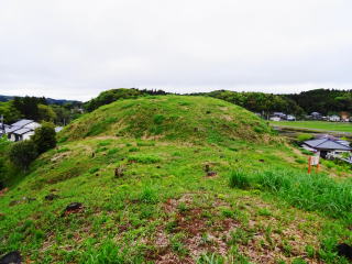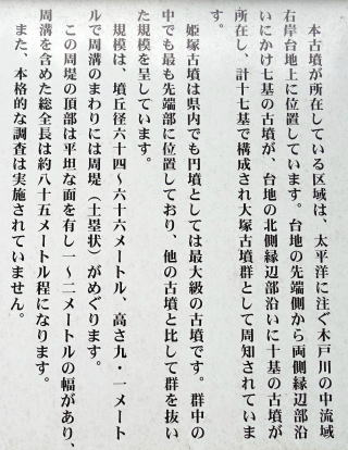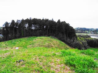 山室姫塚古墳(大塚1号墳)は 墳丘径64~66mの円墳、墳丘高9.1m 2段築成 墳丘の周りには、幅3~5mの周堤がある。 二段目のテラスや、周溝、堤が明瞭に残る 埴輪や土器片などは確認されていない 未調査なので詳細は不明。 7世紀初頭の築造と推定されている 市内を流れる木戸川の中流域、左岸台地上にあり、円墳としては千葉県最大級 古墳の周辺には、このほかに16基の古墳が確認されており、大塚古墳群といわれている。 (山武市HPほかから) |