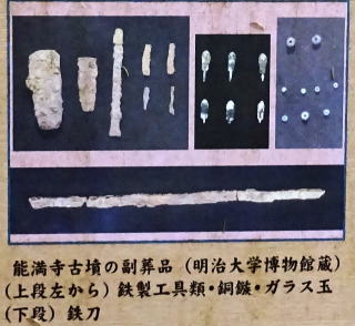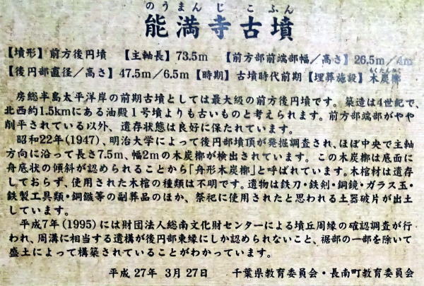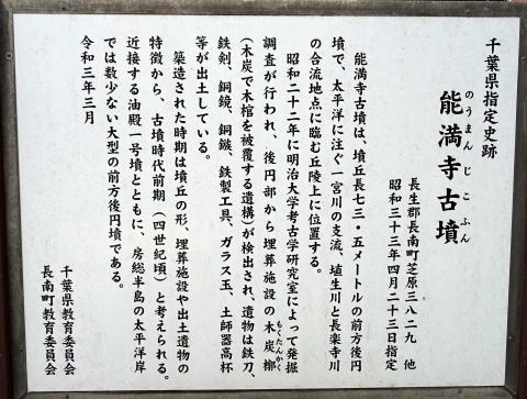 能満寺古墳は 全長73.5mの前方後円墳 周溝は墳丘の周囲を全周せず、後円部前面のごく一部にのみ存在する。 太平洋に注ぐ一宮川の支流、埴生川と長楽寺川の合流地点に臨む丘陵上に位置する。 後円部の木炭槨から、鉄刀、鉄剣、銅鏡、銅鏃、鉄製工具、ガラス玉、土師器高杯等が出土。 墳丘の形、埋葬施設や出土遺物の特徴から、 古墳時代前期(4世紀頃)の築造と推定されている。 昭和22年に発掘調査 平成7年度(1995)に確認調査 (築造年代は古墳時代中期(5世紀)との説明資料も有り) |