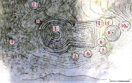 | 旧寺古墳群(フルデラコフングン)は 前方後円墳である第1号古墳を中心に、12基が群をなす5世紀前半の特徴的な古墳群。 1号墳は全長61.7mの前方後円墳 周囲の円墳のうち、1号墳の前方部の前側にある9号墳は最も大きく直径16.2m 最小は後円部のそばの3号墳で直径5.5m 5世紀中ごろの築造と推定されている。 ![]() 旧寺古墳群の実測図 説明板に加筆 |