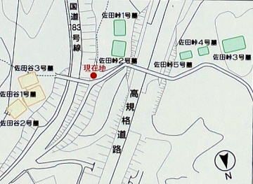 ![]() 佐田谷・ 佐田峠墳墓群の配置図 (説明板から) この図では「北」は下となる。 西(右)から「佐田峠墳墓群3・4・5号墓」 「佐田峠1・2号墓」 「佐田谷1・2・3号墓」 の3地区 現在は、大きな道路ができて、3地区に分断されているが、2つの陸橋で3地区がつながっている。 |
