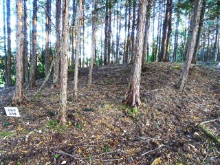| 牛川古墳は 全長21mの前方後円墳 後円部径14m、前方部の幅10m、後円部の高さ2.6m 東城町では前方後円墳が、4基確認されているが、 本古墳は最後の段階のものである。 後円部には、石灰岩の天井石2枚が露出していて、 横穴式石室があると考えられている。 6世紀後半頃の築造と推定されている。 東城の市街地と戸宇の谷を結ぶ峠にあたる標高384mの丘陵尾根上にある。 (説明板から) |