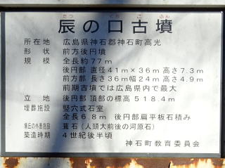 | 辰の口古墳は 全長77mの前方後円墳 前期古墳では広島県内で最大 後円部直径41m×36m 高さ7.3m 前方部長さ36m・幅24m・高さ]4.9m 人頭大の河原石の葺石がある。 墳丘頂部では最古級の円筒埴輪が並んでいる 竪穴式石室は全長6.7m・幅0.8m・高さ1.1m 4世紀後半の築造と推定されている。 後円部頂部の標高は518.4m |