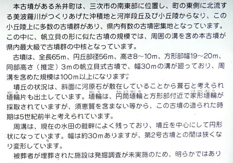 | 糸井大塚古墳は 全長65mの帆立貝式古墳 県内最大級 円丘部径56m、高さ8〜10m 方形部幅19〜20m、同部の高さ(推定)3m 幅30mの溝がめぐる 周溝を含めた規模は100m以上の大きさとなる。 河原石の葺石あり 埴輪片が出土 円筒埴輪と方形部付近で家形埴輪 5世紀前半の築造と推定されている。 |
