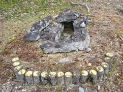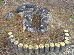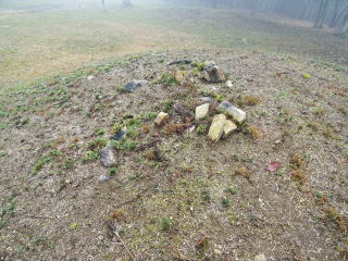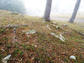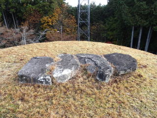 ![]() 墳頂部に天井石が露出している 左側に前方部 |