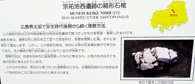 | 宗祐池西(ソウスケイケニシ)遺跡の箱形石棺 三次市南畑敷町の宗祐池西遺跡で見つかった箱形石棺を移築 四方に小型の石を積み上げて作られていて、その構造が竪穴式石室によく似ている。 6世紀末〜7世紀前半ころの築造と推定されている。