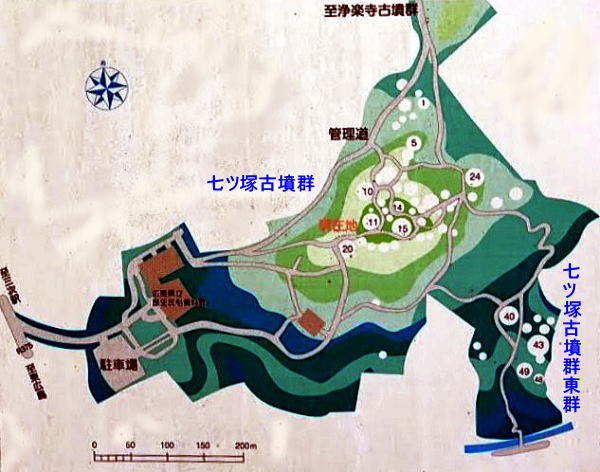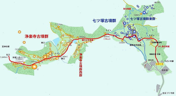 ![]() 国史跡 浄楽寺・七ツ塚古墳群全体図 左が北となる (ウォーキングマップに加筆)