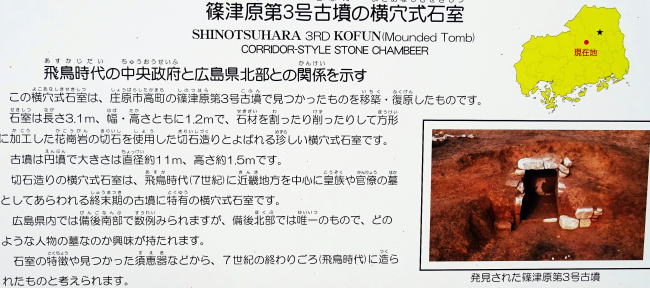 | 篠津原(シノツハラ)第3号古墳の横穴式石室 (移築復原) 直径11m・高さ1.5mの円墳 花崗岩の切石造りの石室は長さ3.1m、幅高さともに1.2m 7世紀の終わりごろの築造と推定されている。