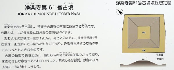 | 浄楽寺61号古墳 一辺19m・高さ2.7mの方墳 墳頂部はほぼ平坦 長さ2m・幅0.6m深さ0.45m・の箱形石棺から 鉄剣、鉄器の破片、人骨の一部が出土 丘陵上の古墳が密集したところに造られている。