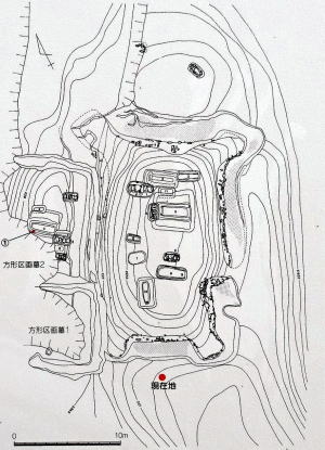 説明板から![]() 矢谷古墳(矢谷弥生墳丘墓)遺構配置図 南東側の突出部のところに くびれ部があるので 「四隅突出型前方後方墳」といわれている。 平成24年(2012)の分析調査で 方形区画墓の@から出土したガラス小玉は 古代ローマ帝国で生産された ガラスの特徴的な成分である ナトロン(蒸発塩)が含まれていることが 分かった。 |