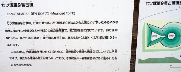 | 七ツ塚9号古墳 全長29.5mの前方後円墳 前方部を西に向ける 後円部は直径21m、高さ4.5m(北側) 前方部幅16m、高さ2.3m(北側) くびれ部は幅10.5m 急斜面に立地するため左右対称になっておらず、北半分が大きい 墳丘のテラス(段)はないが、後円部の北側中ほど以下の傾斜が緩くなっている。 埴輪あり 葺石あり。 5世紀後半〜6世紀前半の築造と推定されている。 丘陵の北側斜面に築かれている