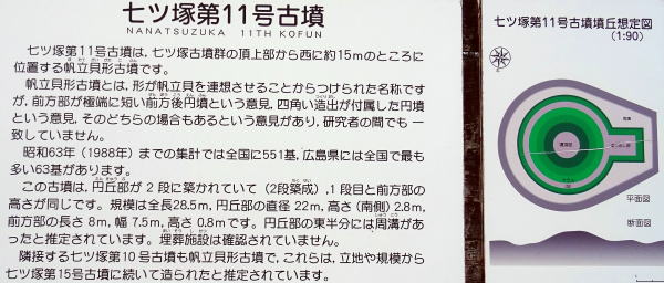 | 七ツ塚11号古墳 全長28.5mの造り出し部を西に向けた帆立貝形古墳 円丘部直径22m、高さ(南側)2.8m、造り出し部長さ8m、幅7.5m、高さ0.8m 周溝は円丘部側の東半分にあった 墳丘の円丘部は2段築成で、段がほぼ円形にめぐり、造り出し部の平坦面につながる。 埋葬施設は確認できていない。 七ツ塚古墳群のある丘陵の頂上部から南にのびる尾根上に造られている。