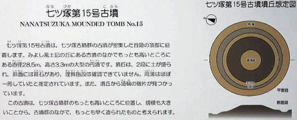 | 七ツ塚15号古墳 直径28.5mの円墳 高さは(北側)3.3m、(南側)3m 2段築成 墳丘の低いところに段が一周 周溝はほぼ一周している 葺石あり、埴輪あり 埋葬施設は確認できていない 七ツ塚古墳群がある丘陵の頂上に造られている。 浄楽寺・七ツ塚古墳群のなかでもっとも高いところにある大型の円墳