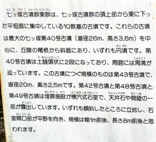 | 丘陵の頂上部から東に下った平坦面に集中して造られた10数基の円墳からなる支群。 七ツ塚40号古墳は 直径26m・高さ3.6mの円墳で、支群中最大。 七ツ塚43号古墳は 直径20m・高さ2.5mの円墳 42・48・49号古墳は横穴式石室がある。 |